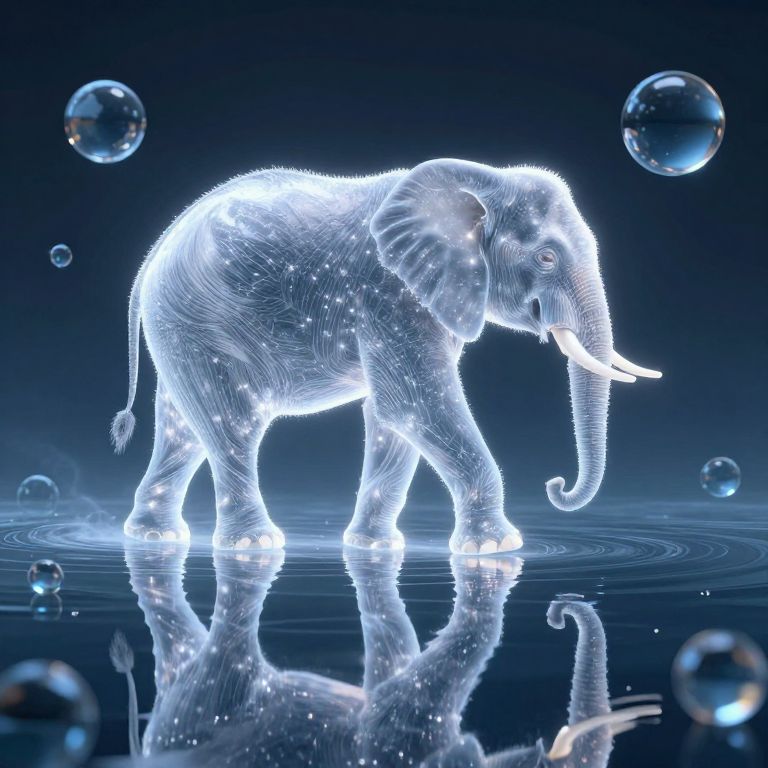 This digital CGI image features a glowing, neon-blue, wireframe-style elephant standing on a reflective water surface. The elephant's translucent, detailed texture reveals its skin and hair strands, with white highlights emphasizing its form. Surrounding the elephant are floating, semi-transparent bubbles of varying sizes. The background is a deep, dark blue gradient, enhancing the luminous effect of the elephant. Ripples in the water beneath the elephant mirror its reflection, adding depth to the composition. The overall style is futuristic and ethereal, combining elements of science fiction and natural wildlife.
