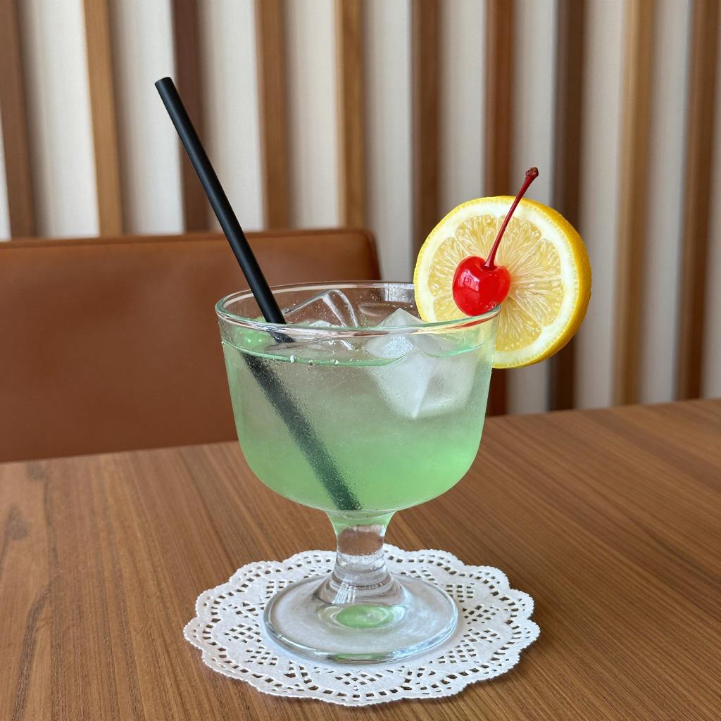Glass bowl with green cocktail, lemon slice, ice cubes, red cherry, black straw, white lace doily, on wooden table. Brown leather chair in background. Vertical wooden slats on wall. Bright colors, clear glass, simple setting.