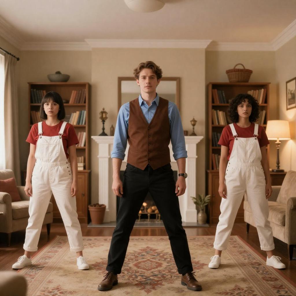 Photograph of three people in a cozy living room. A man in a blue shirt, brown vest, and black pants stands in the center, legs apart. Two women in white overalls and red shirts, one on each side, mimic his stance. The room has beige walls, a fireplace, bookshelves, and patterned rugs. Warm lighting from lamps illuminates the scene.