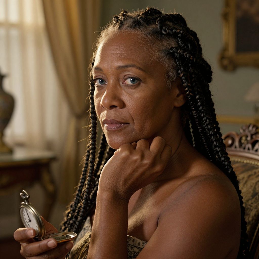 Craft a hyperrealistic portrait showcasing an African-American Micronesian woman with captivating blue eyes and intricate braids. Pose her serenely yet enigmatically in a three-quarter view, one hand gently on her chin, the other holding an antique pocket watch. Set against a vintage parlor room's blurred backdrop adorned with ornate furniture, soft golden light filters through sheer curtains. Employ high-resolution textures to capture fine lines around her eyes and mouth, conveying wisdom beyond her years. Highlight the interplay of light on her smooth olive skin, illuminating each hair strand and casting a warm glow across her face. Incorporate subtle imperfections like slight wrinkles around her neck for enhanced photorealism. This image seamlessly blends an intimate close-up with the atmospheric ambiance of a bygone era, inviting viewers to explore the depths of her enigmatic gaze and uncover untold tales.