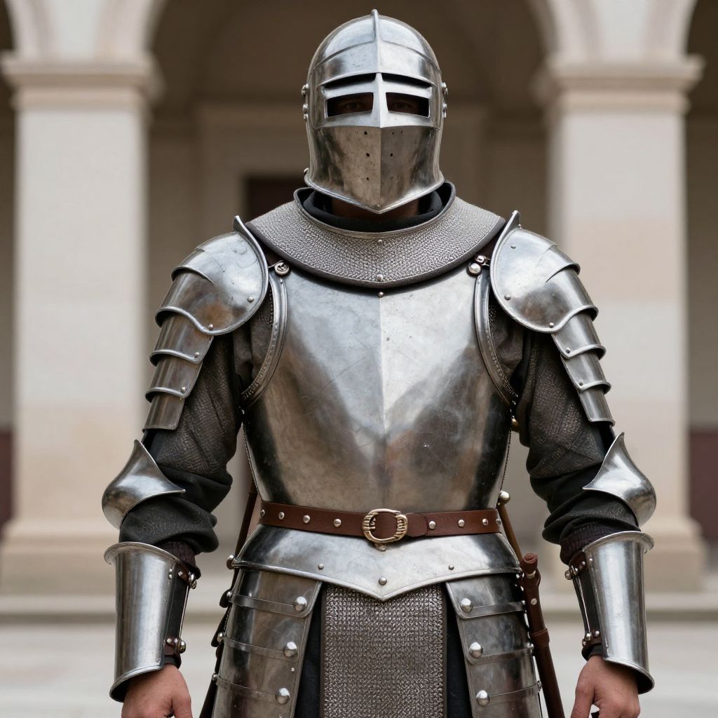 Photograph of a medieval knight in shiny, silver steel armor with a visored helmet, brown leather belt, and chainmail, standing in front of