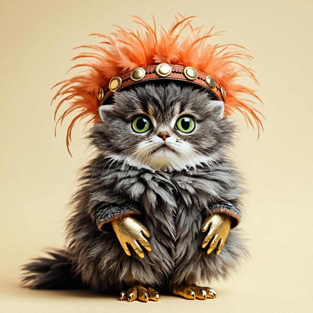 Digital artwork of a small fluffy kitten with large green eyes, featuring a cream beige fur chest and charcoal grey body fur. The kitten is adorned with a decorative feathered orange headband with white accents, set against a solid sunset orange background.