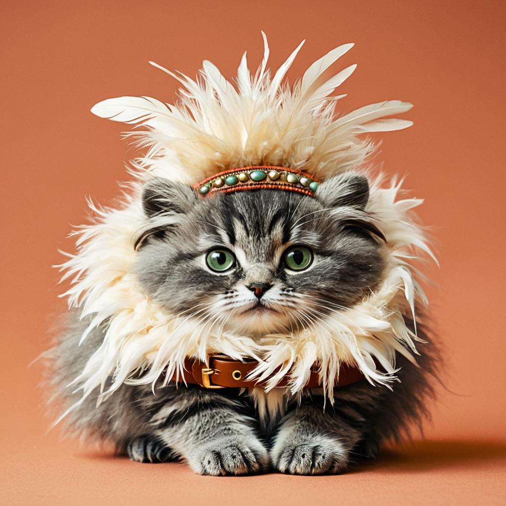 Digital artwork of a cute, rounded fluffy creature with big green eyes, the fur on top of the head is bright coral with tiny scales, fur in front of the body is cream beige, and the rest of the body is charcoal grey, with tiny gold fingers and toes, wearing feathered headband and mahogany belt, set against a sunset orange background with hand-drawn waves.