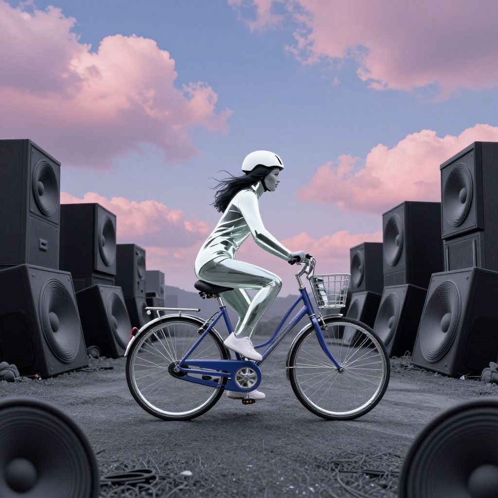 Digital artwork of a woman in white outfit and helmet riding a blue bicycle through a field of large speakers, under a pink and blue cloudy sky.