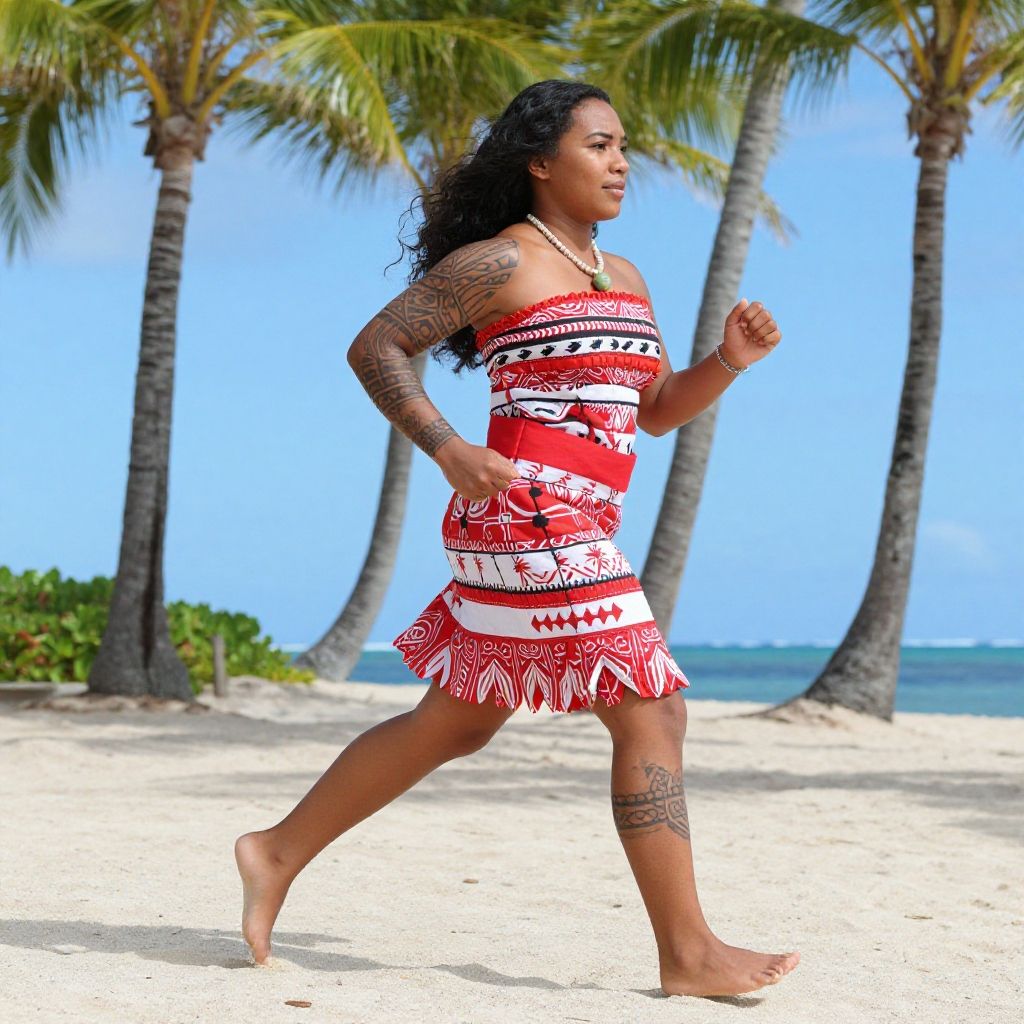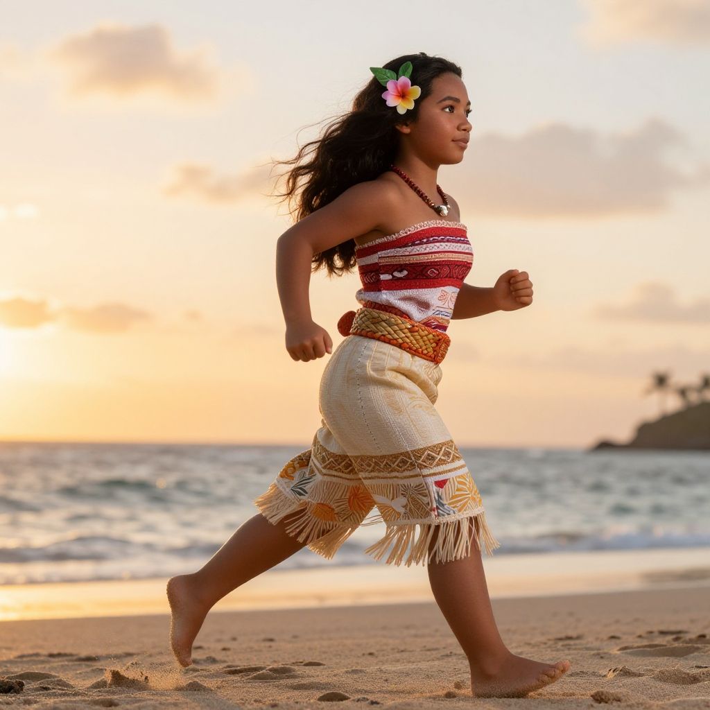 Moana running costume rendition emphasizing functionality and cultural heritage, with colorful lava-red fabric, tribal tattoo motifs adorning the arms and legs, and barefoot runner amidst palm trees and sandy shores under a bright blue sky.