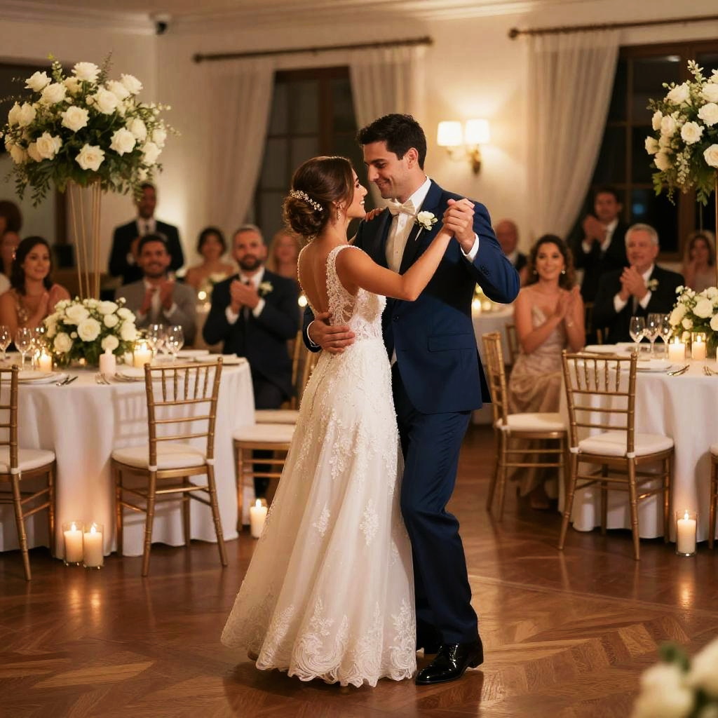Fotos casamento showcasing an elegant indoor wedding reception, ambient warm lighting, tables decorated with white roses and candles, bride and groom dancing closely on a wooden floor, joyful guests clapping around, sophisticated and intimate mood