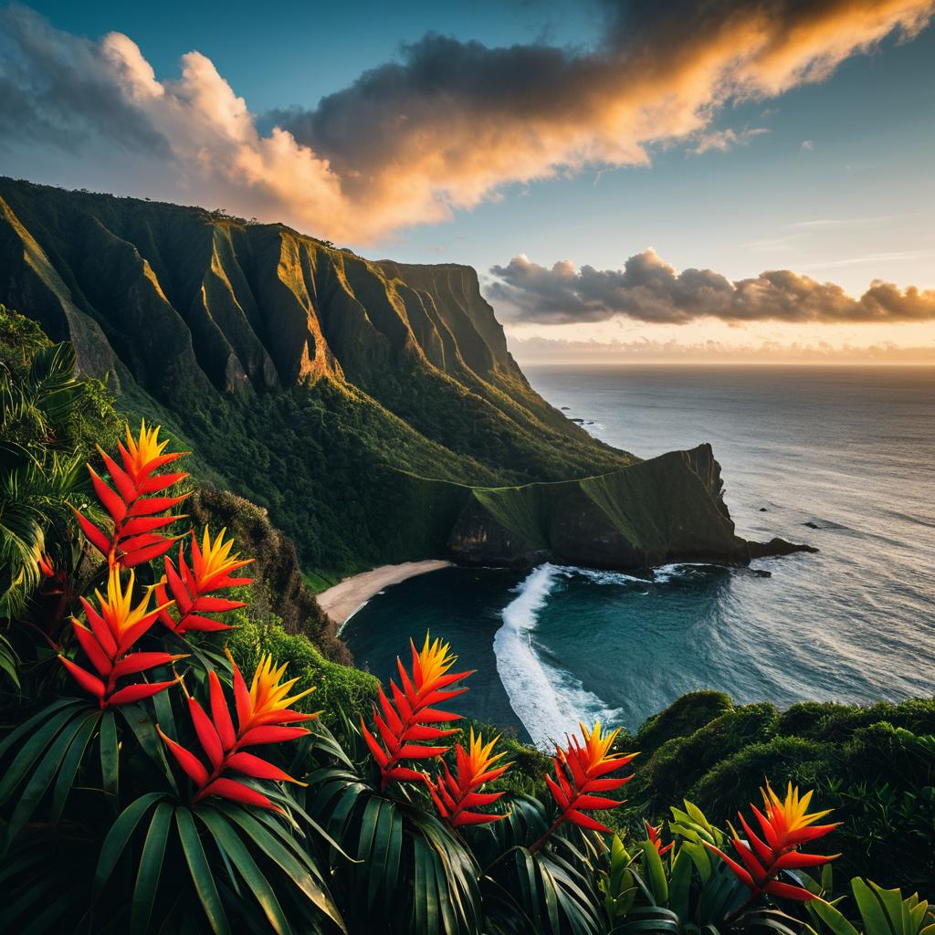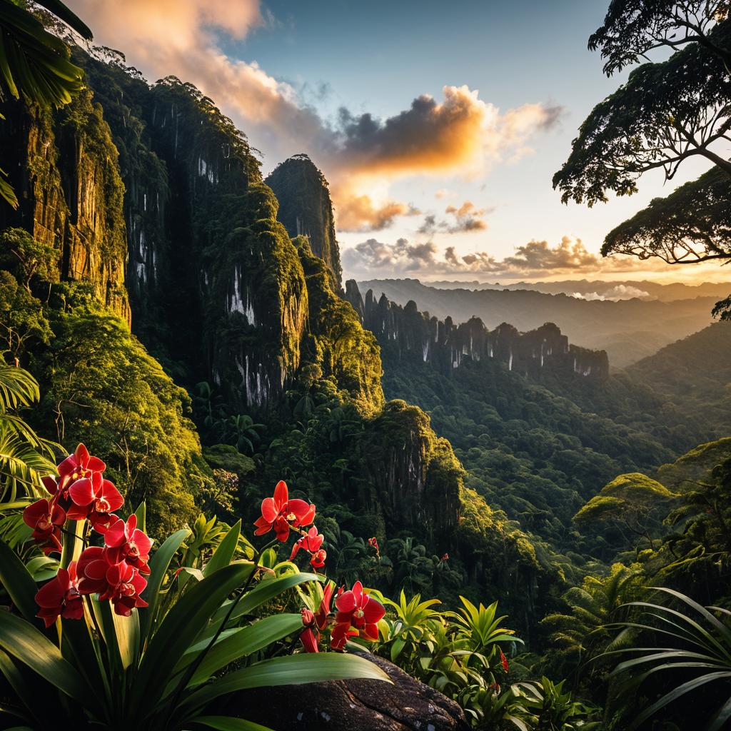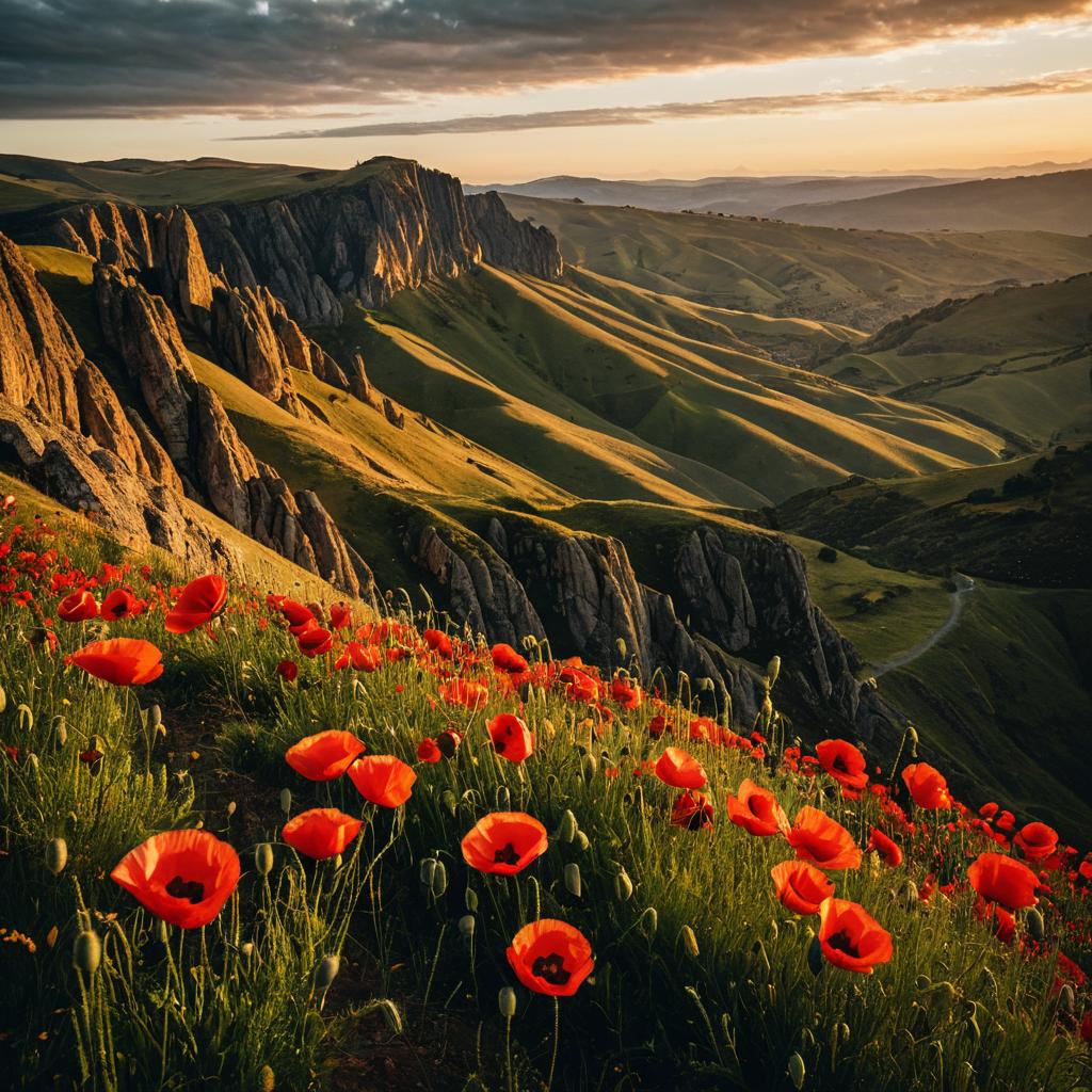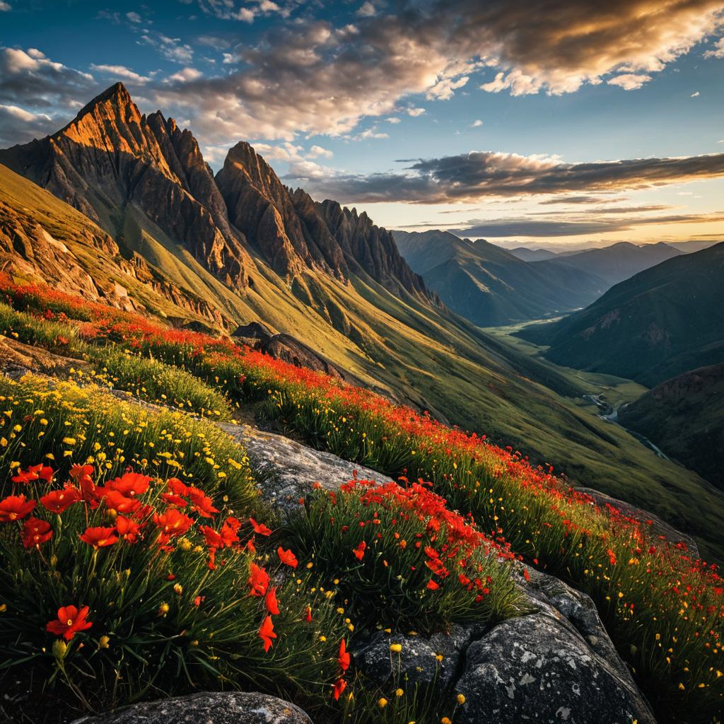 A stunning mountain range with sharp peaks and lush green valleys, bathed in the golden light of midday. The rugged rocks are adorned with bright red wildflowers, adding vibrancy and contrast. In the foreground, an isolated cliff face reflects warm hues from the setting sun behind it. A few clouds drift above, adding depth to the scene. Captured using a Sony Alpha with a panoramic lens, this 16K, crystal-clear resolution image showcases the grandeur of nature in the style of high-quality landscape photography.