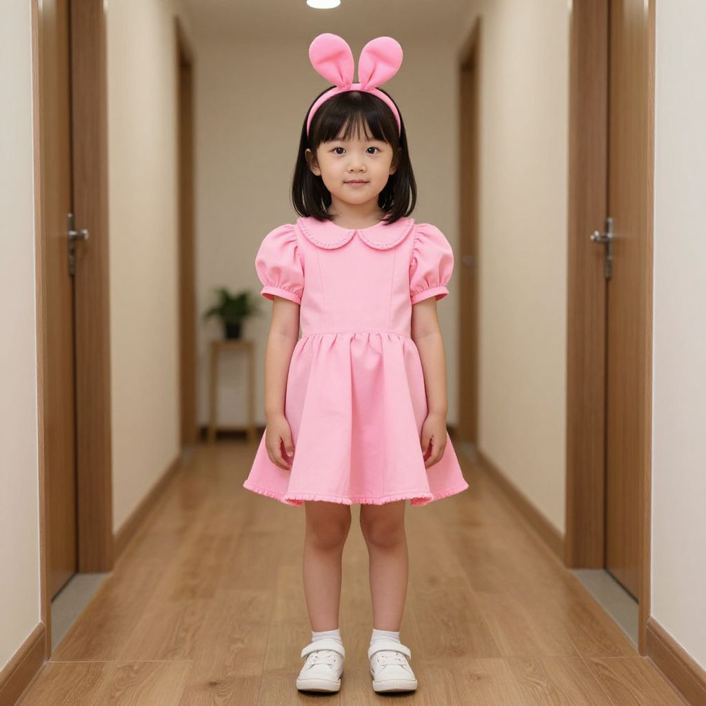 Pink Wednesdays Costume, young girl in a pink costume standing in a hallway