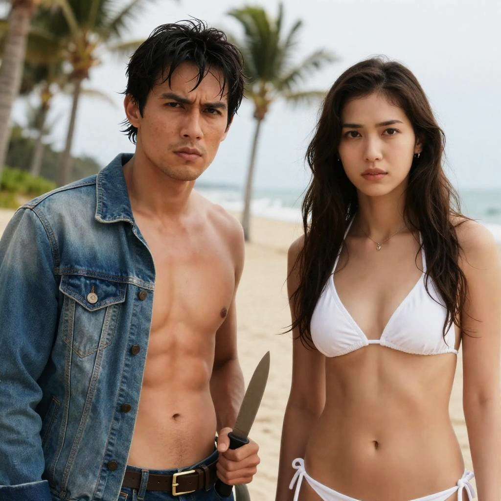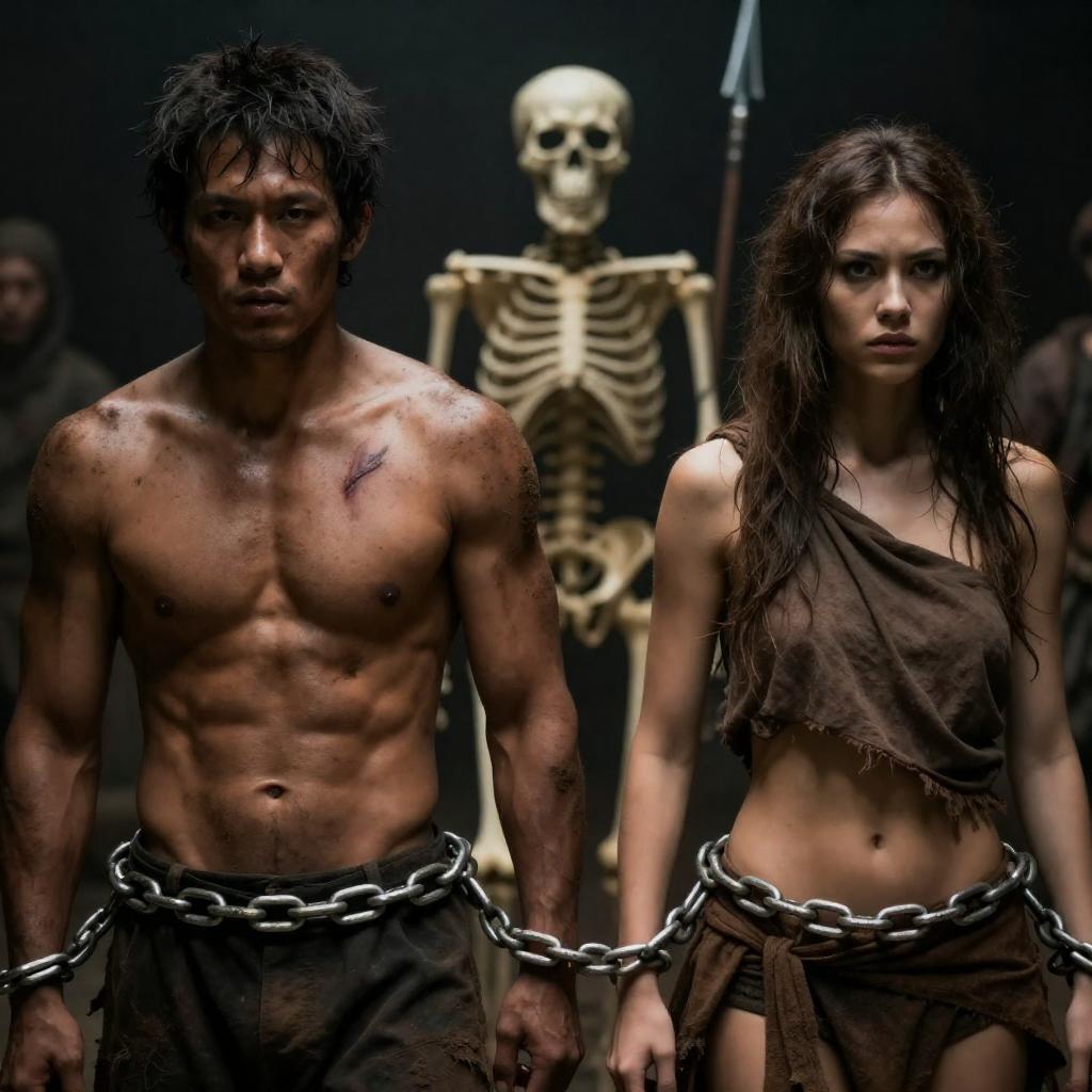 Two shirtless, muscular men with dark skin, messy hair, and dirt-covered bodies are chained together. One man has a scar on his chest. The woman on the right has long, dirty brown hair, a one-shoulder brown cloth, and an intense expression. A skeletal figure with a spear is in the dark background. The setting is dimly lit.