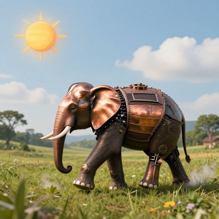 A clockwork elephant with copper-plated skin walks on steam-powered legs across a grassy meadow, toiling under a sky where the sun playfully changes shape hourly.