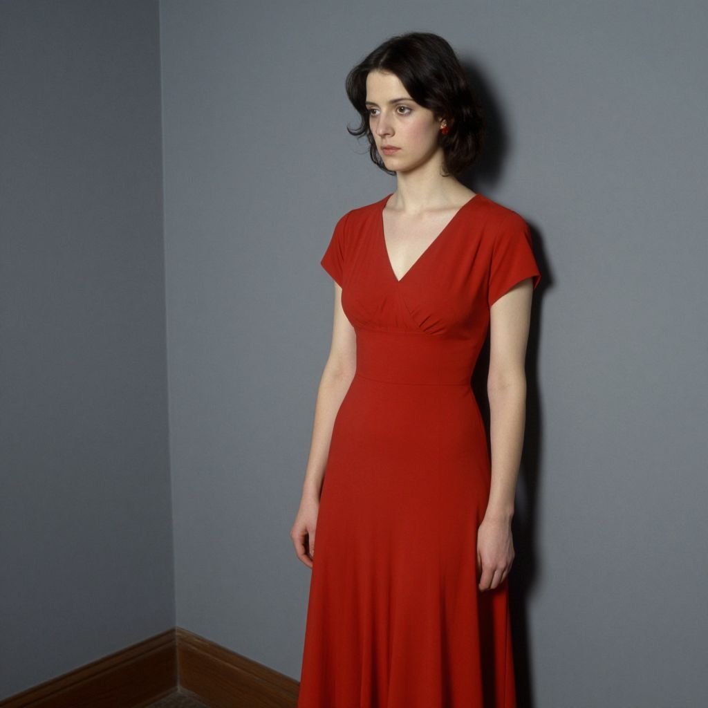 Photograph of a young woman with fair skin and dark, wavy hair standing against a gray corner wall. She wears a simple, short-sleeved, V-neck red dress that reaches her ankles. Her expression is neutral, with a slight downward gaze. The lighting is soft, casting a subtle shadow on the wall behind her. The wooden baseboard is visible at the bottom. The overall mood is calm and understated, with a minimalist background emphasizing her red dress and subdued facial expression.