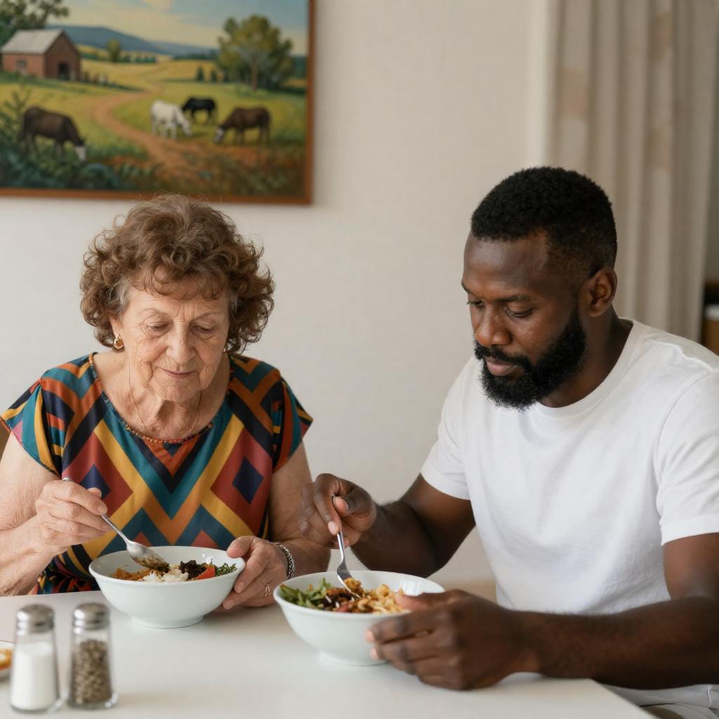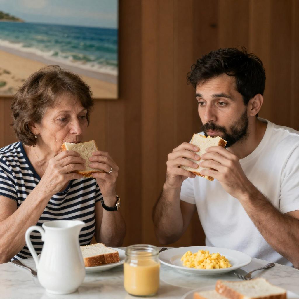 An elder woman with short brown hair wearing a black and white striped shirt and a bearded man with short black hair in a white t-shirt eat sandwiches at a table. The table features white plates with bread and scrambled eggs, a white pitcher, and a glass jar filled with a yellow substance. The background includes brown wood-paneled walls and a beach painting.