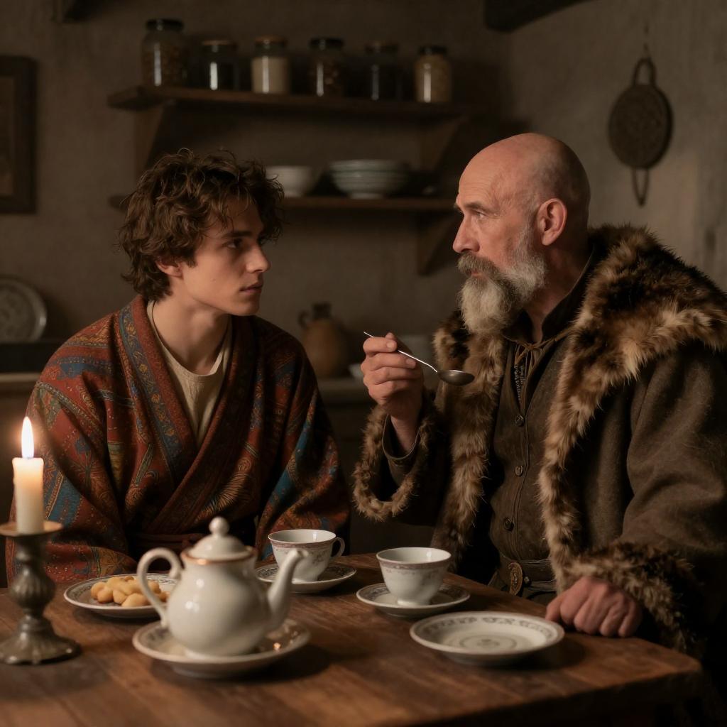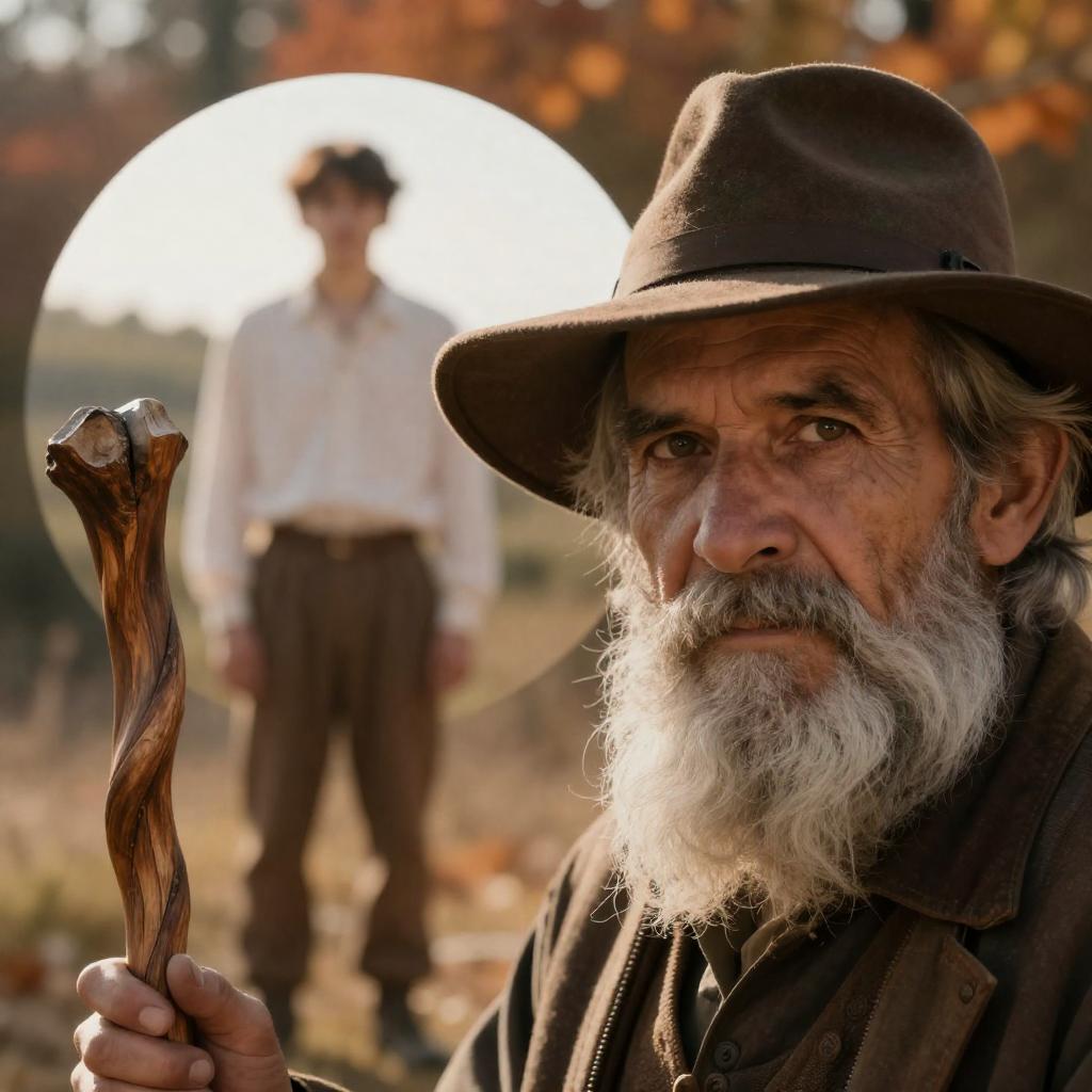 Old man with dark beard and grimy face, flames engulfing left side, facing young man in blue shirt, wooden shack background, broken window, hanging tools, intense expressions. Firelight illuminates scene, man's right hand raised defensively. Two people, rustic setting.