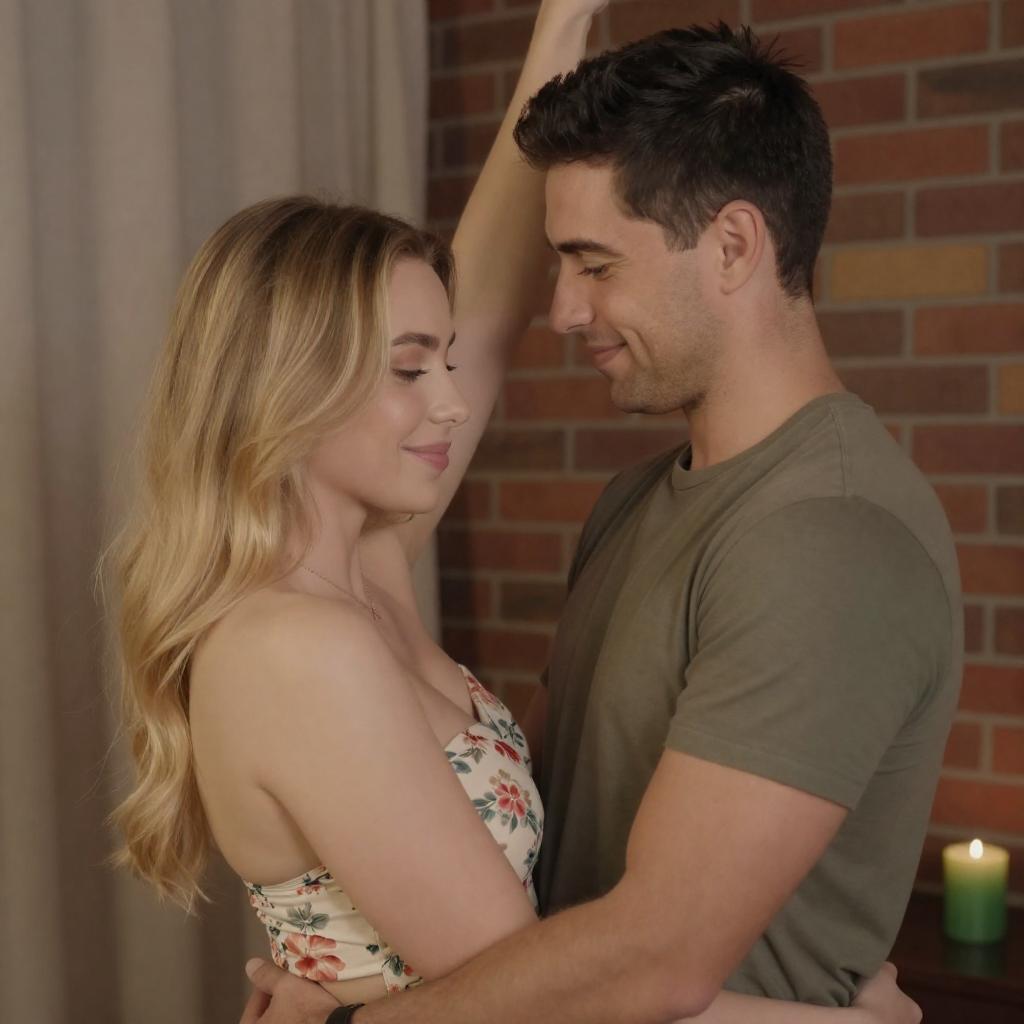 Photograph of a kitchen scene with two people standing close. Blonde woman with long hair in off-shoulder white shirt, looking at brown-haired man in blue and black striped polo. Both looking at each other, hands near chests. Stainless steel fridge on left, brown cabinets, and kitchen background. Woman's expression is neutral, man's is slightly smiling.