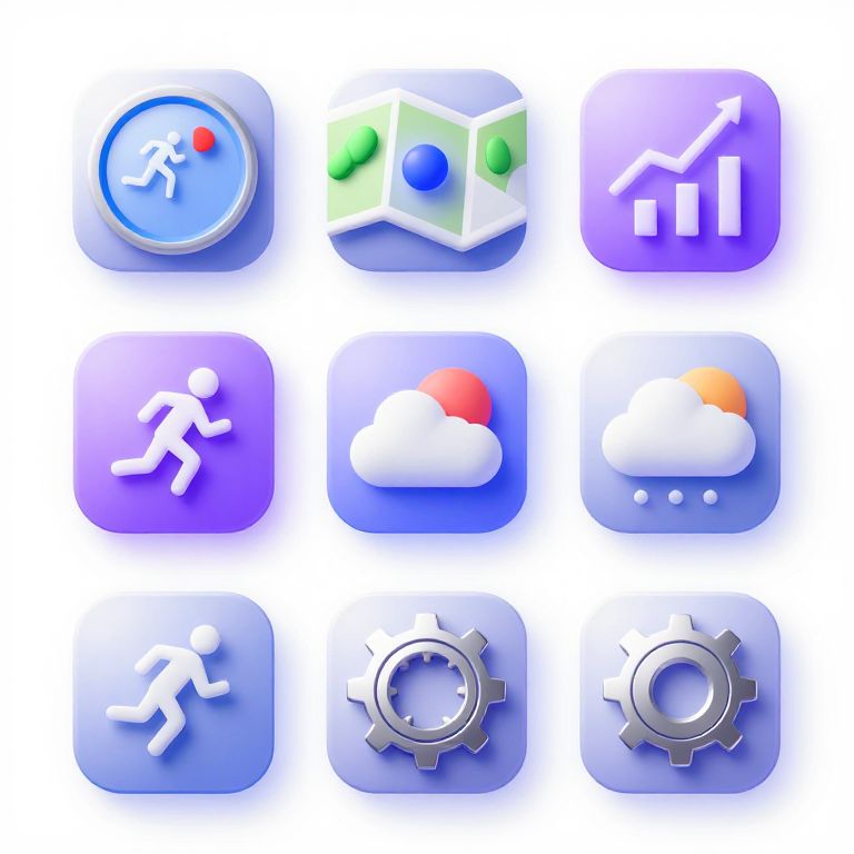 Rendering 6 icons for an running app - icon for gps, map, stats, health, weather, settings, metal with purple light colour,