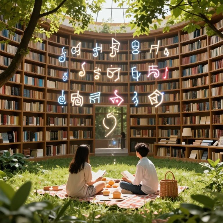 A library where books breathe and sing sends melodies into the air, forming shimmering glyphs that visitors picnic inside.