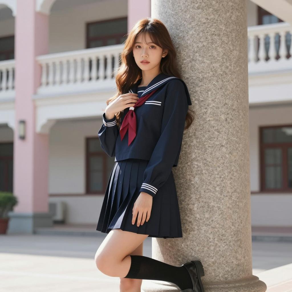 Asian woman with long brown hair in a school uniform, light blue short-sleeve shirt, black bow tie, blue plaid skirt, black thigh-high socks, standing by a window with white curtains, right hand holding curtain, left hand on desk, map on wall in background. Sunlight streams through window.
