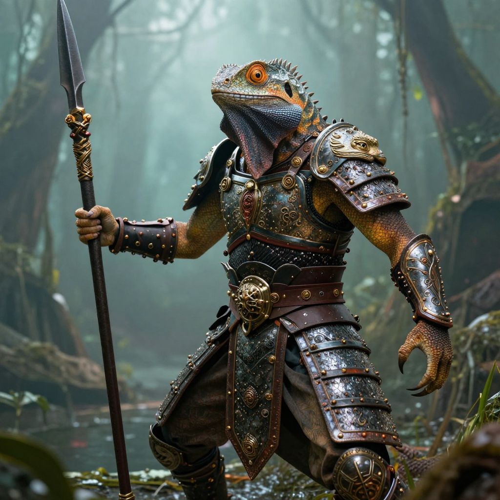 Lizard humanoid warrior clad in ornate armor, blending reptilian features with human anatomy, fierce expression, wielding a tribal spear, set against a misty swamp background, vivid colors and dynamic lighting, cinematic composition.