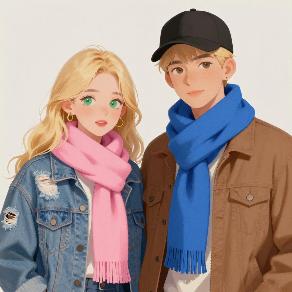 Digital illustration of a young man and woman wearing colorful scarves and casual jackets. The woman has long blonde hair, green eyes, and is dressed in a ripped denim jacket with a pink scarf. The man wears a black baseball cap, brown jacket with a blue scarf, and has short blonde hair with brown eyes. Both have light skin tones and freckles, set against a neutral background.