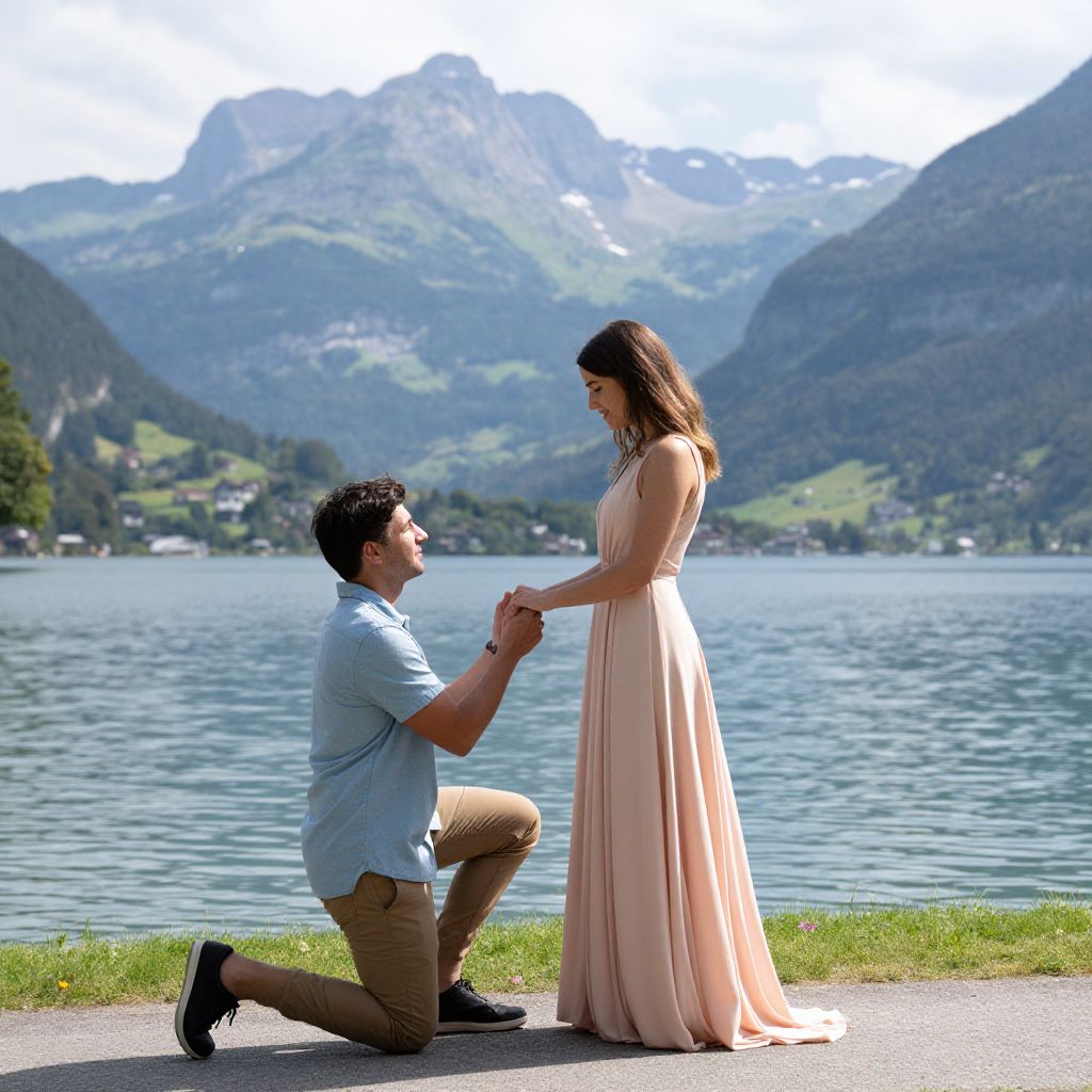 Man kneels on one knee, holding hands with a woman in a flowing peach dress, proposing by a serene lake surrounded by majestic mountains near Lucerne.