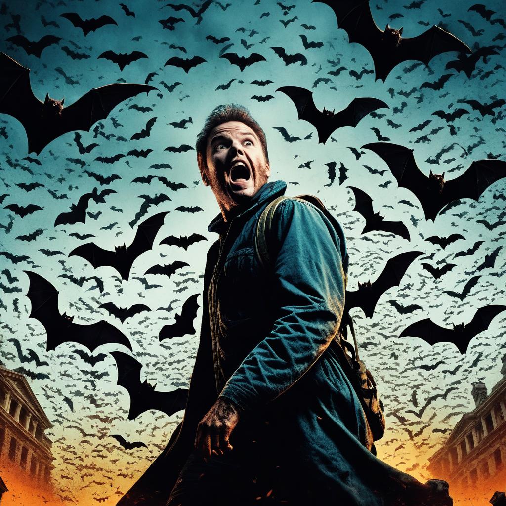 Horror movie poster featuring a swarm of bats attacking a terrified traveler