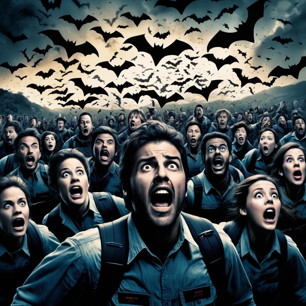 A large group of people with terrified expressions looking upward at a night sky filled with numerous flying bats. A bright full moon illuminates the dark blue sky, creating a dramatic and eerie atmosphere.