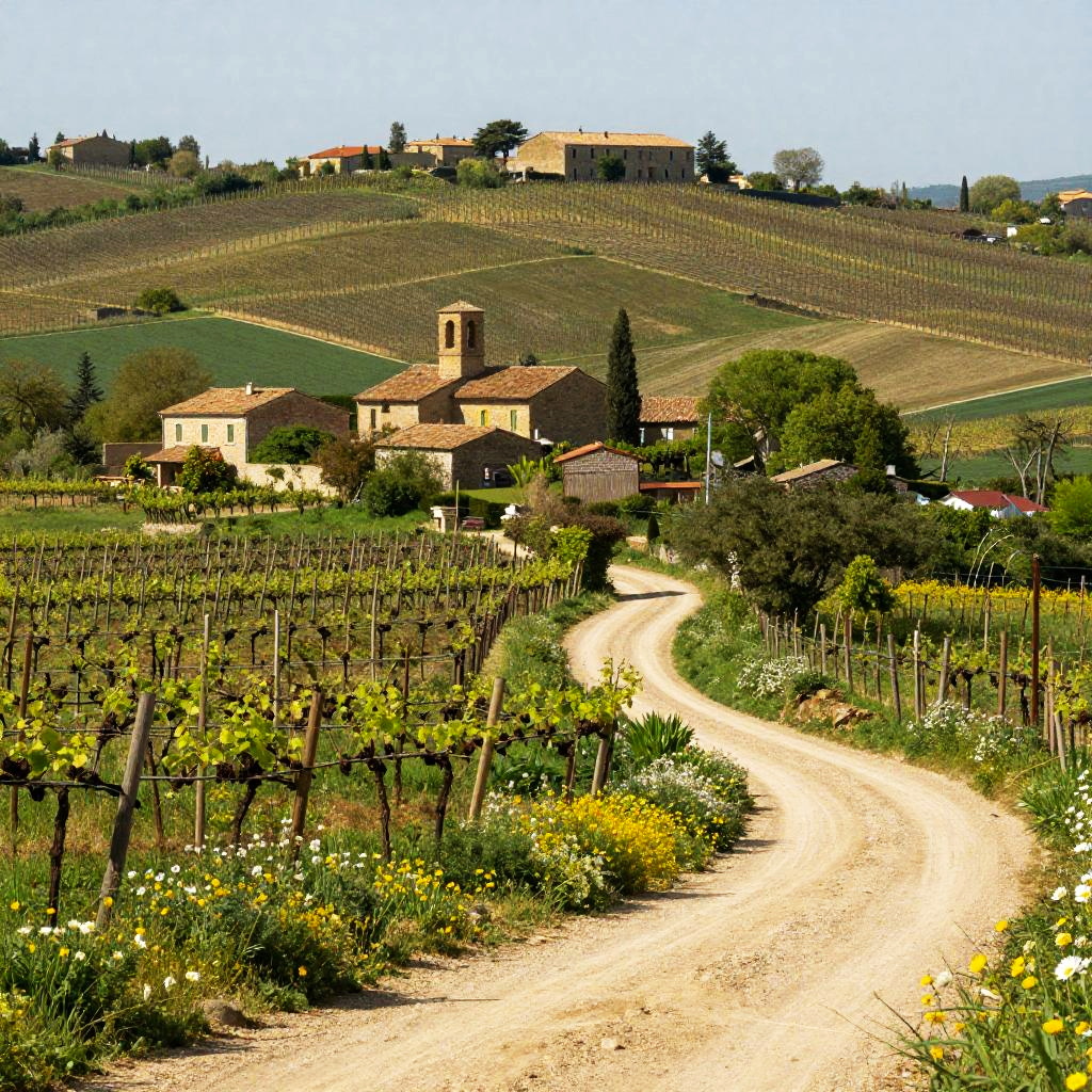 Adria countryside in springtime, rolling hills covered with blooming wildflowers, vineyards stretching to the horizon, old stone farmhouses with terracotta roofs, winding dirt roads, soft sunlight casting gentle shadows, a peaceful and idyllic rural landscape full of life and color