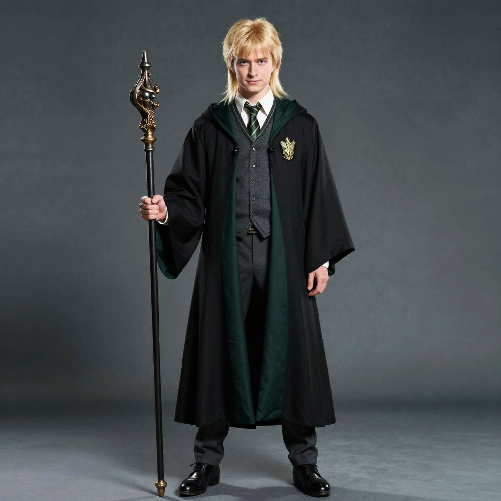 A man dressed in a detailed Lucius Malfoy cosplay costume from the Harry Potter series stands confidently holding a long, ornate staff. The full-body image features his signature long blonde hair, dark robes with green and silver accents, and a formal vest and tie, capturing the dark and elegant style of the character.