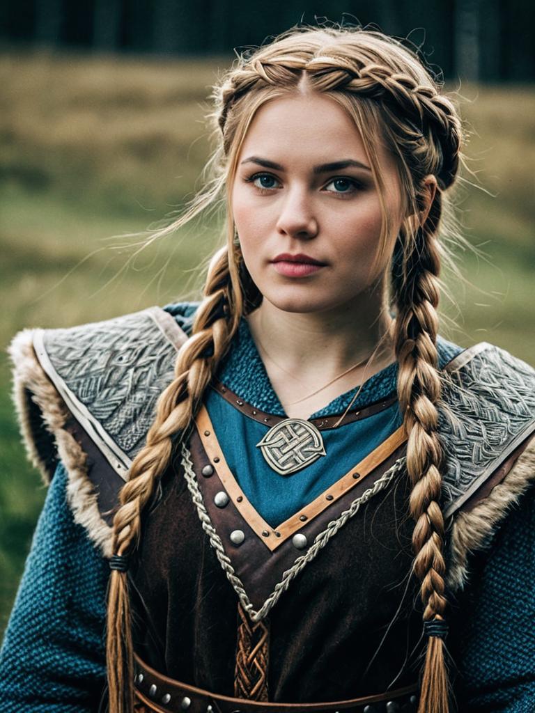 Woman in Viking Braids costume, photorealistic cosplay portrait, cinematic realism