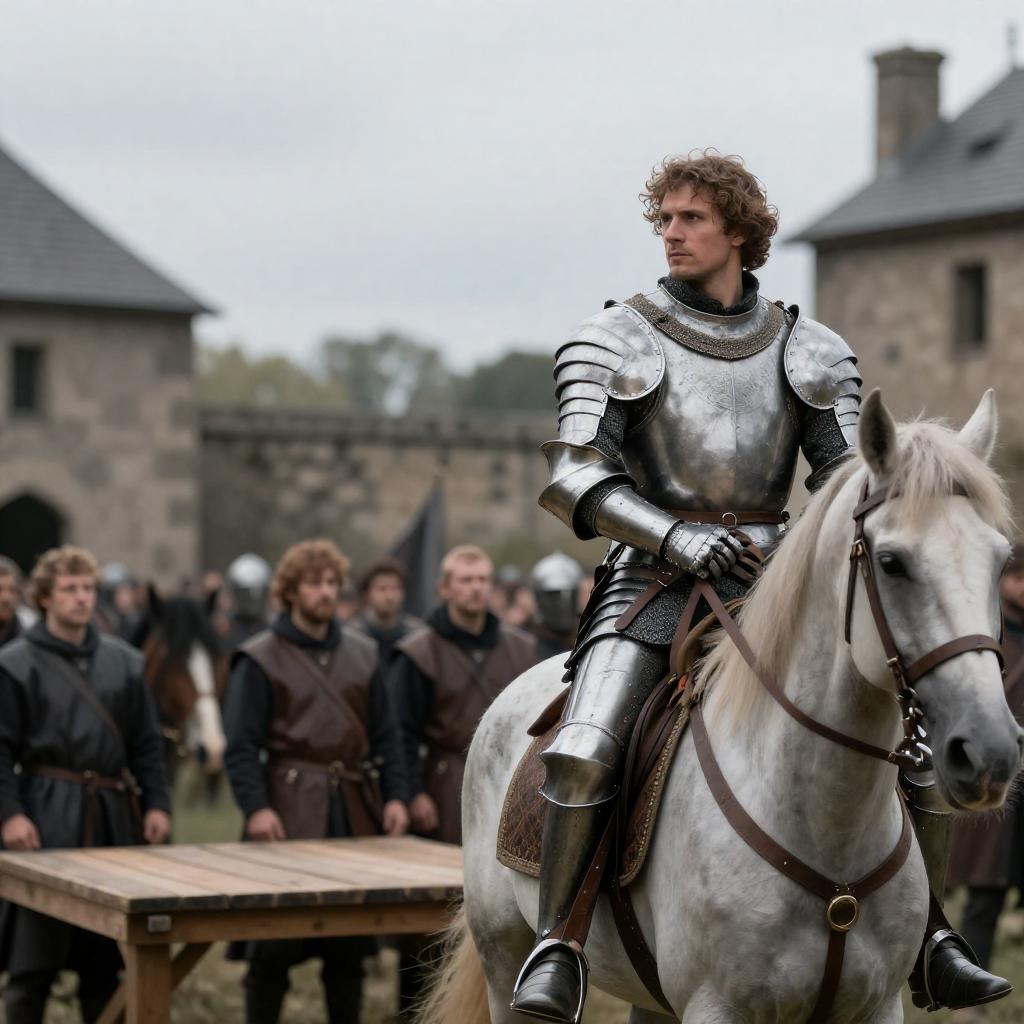 Medieval battle scene. Curly-haired man in shiny silver armor rides horse, looking determined. Wooden platform in background, several men in dark clothes and leather vests, watching. Horse's armored head lowered. Overcast sky, stone buildings. Men on platform have neutral expressions.