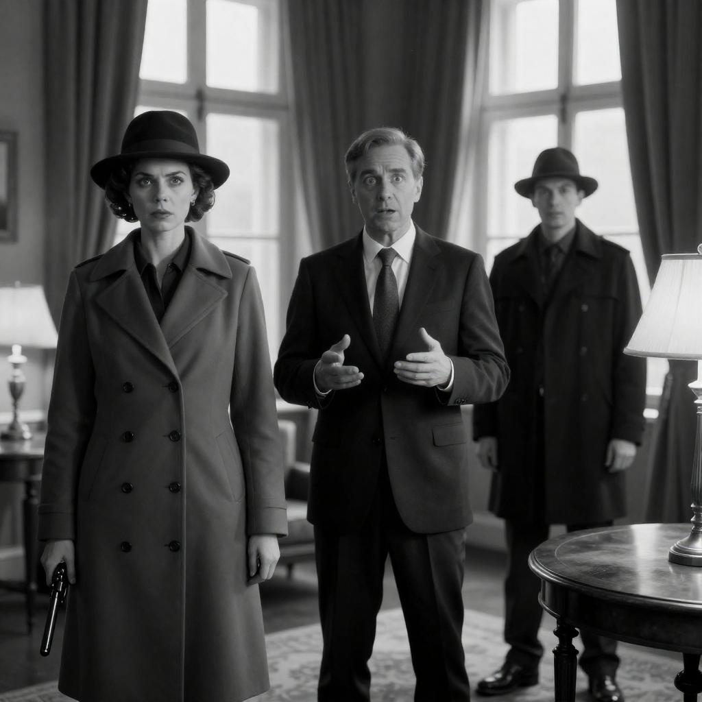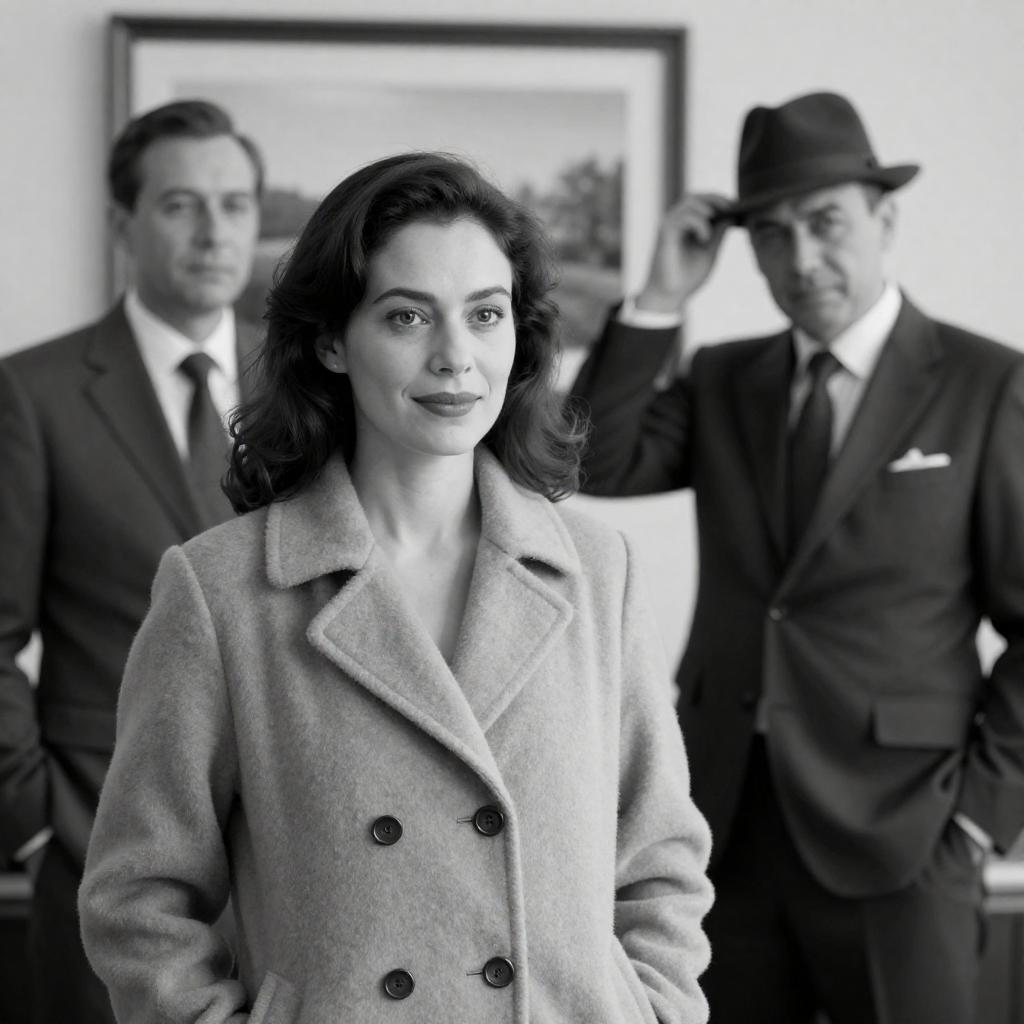 Black-and-white photograph. Woman in foreground, medium-close, wearing a wool coat, wavy hair, slightly smiling. Two men in background, suits, one adjusting his hat, both serious. Framed landscape picture on wall. Men standing side-by-side, woman slightly left.