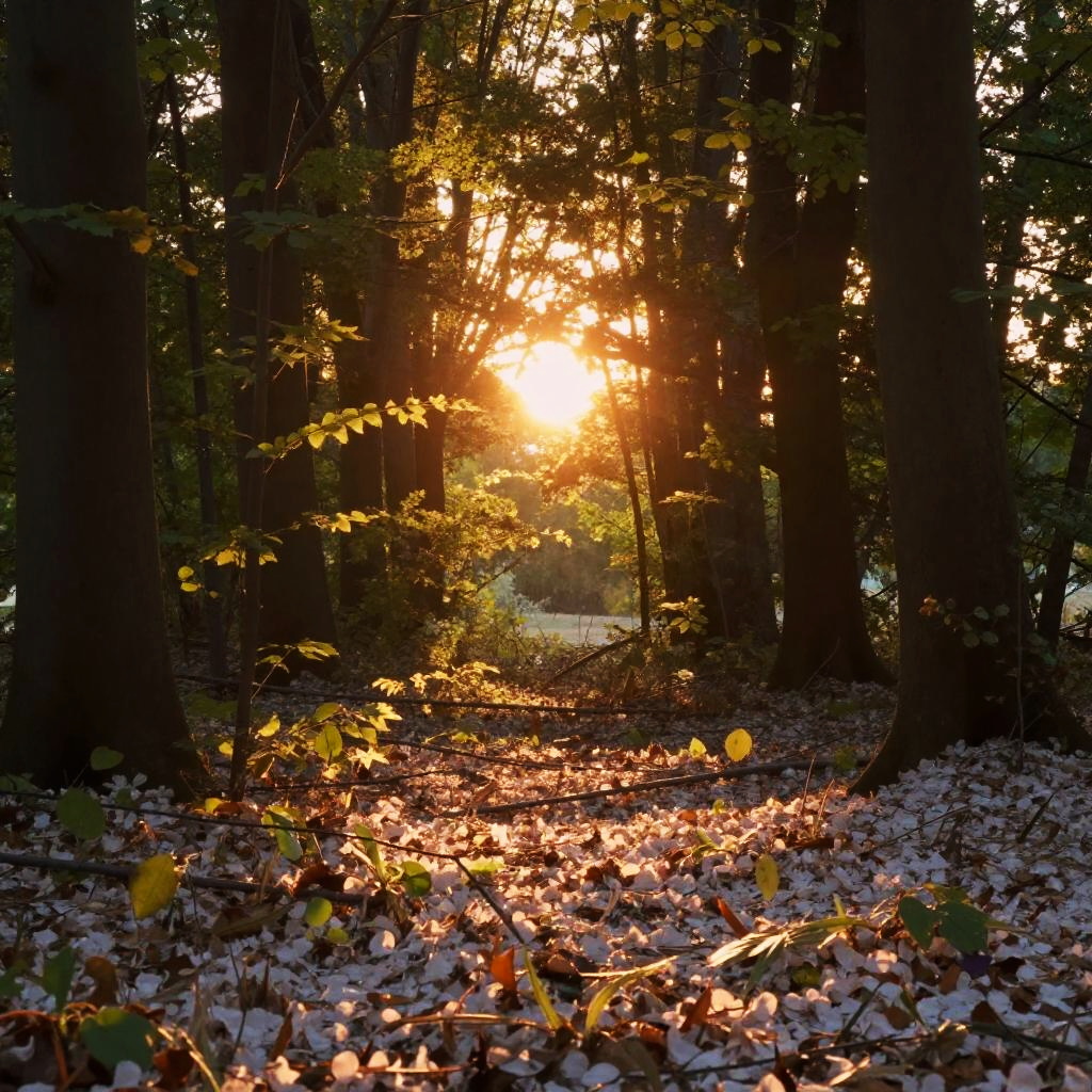 Juliet sunset in a dense forest clearing, sun rays filtering through tall trees, warm amber light illuminating delicate petals and leaves, tranquil and enchanting environment, ultra-realistic