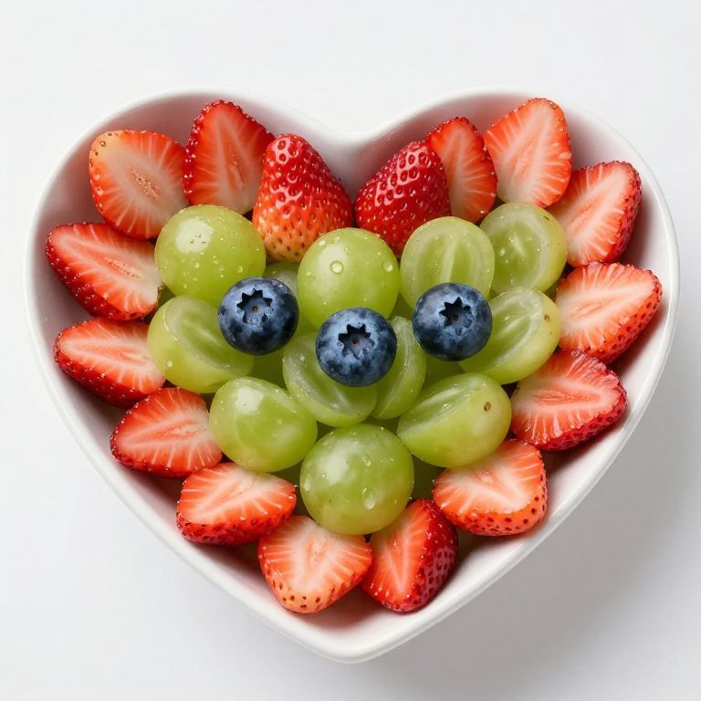 Heart-shaped bowl filled with vibrant fruit salad, featuring halved strawberries forming the outline, green grapes creating the center, and three dark blueberries as eyes, all arranged to resemble a cheerful face.