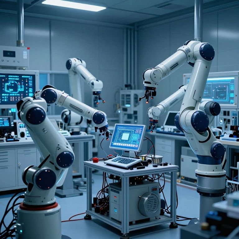 Photograph of a high-tech laboratory illuminated with cool blue lighting. The room features four white robotic arms with black joints, positioned around a central metal workstation holding a laptop displaying complex data on a blue screen. The background includes various lab equipment, screens displaying technical data, and cabinets. The robotic arms have multiple joints and are equipped with cameras and sensors. The overall scene has a futuristic, industrial feel with a focus on advanced robotics and data analysis.