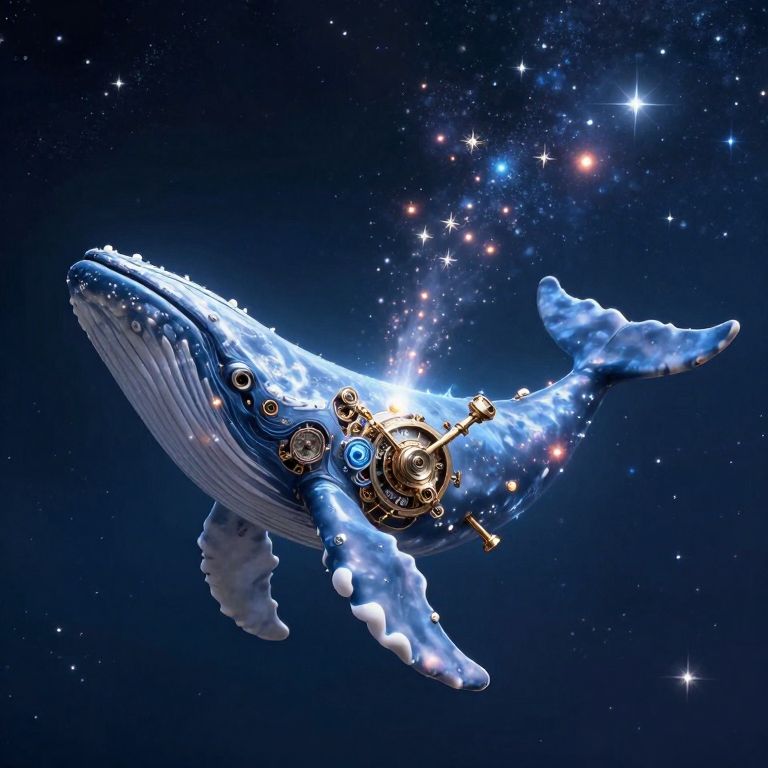 Digital artwork of a blue whale with intricate clockwork machinery, floating in a star-filled, deep-space background. Whales' tail and fins illuminated,