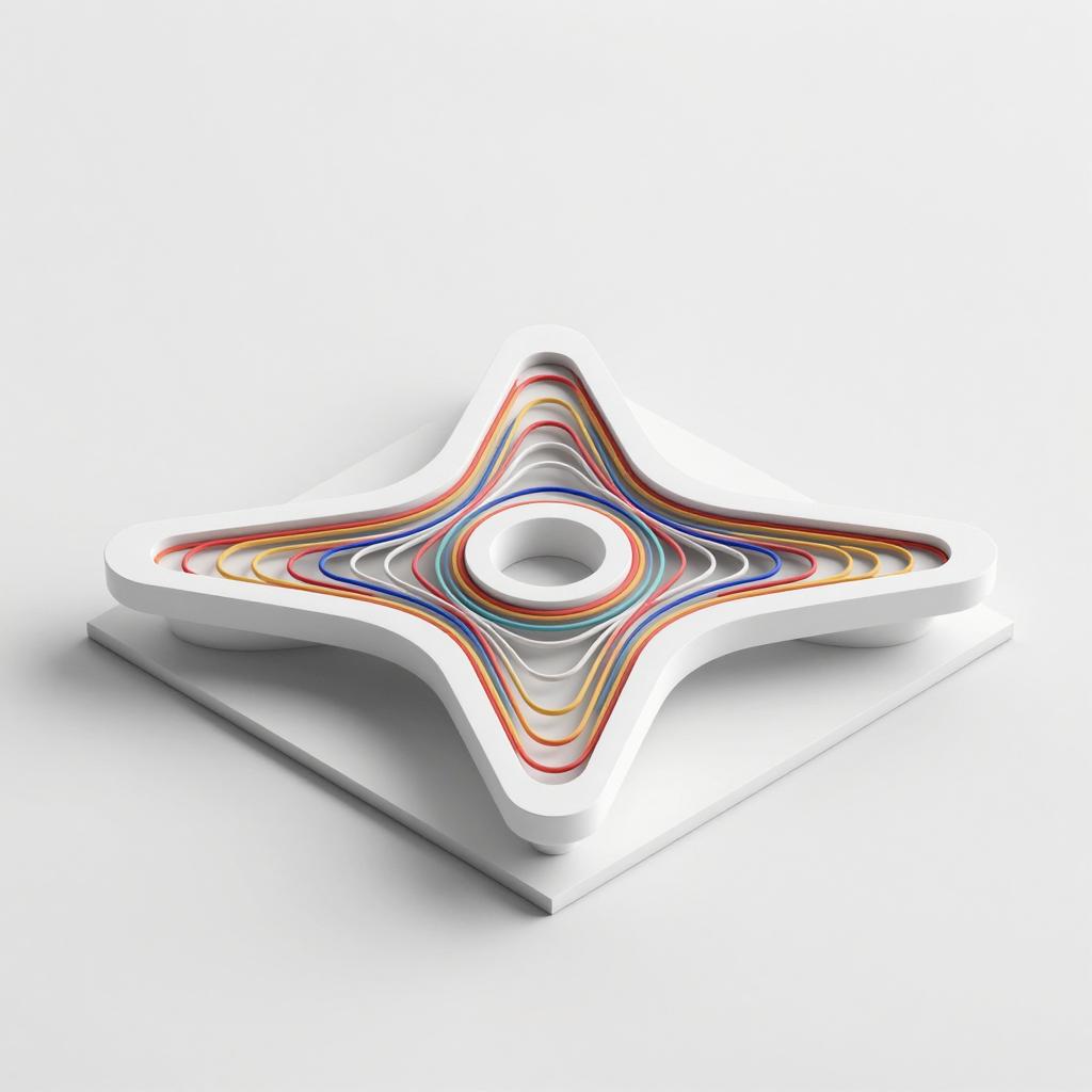 Ultra-realistic photorealistic 3D rendering of a parametric architectural model with organic, star-shaped design featuring multiple layers in vivid rainbow colors and white. The model is presented in a minimalistic white studio environment with soft lighting, showcasing intricate contours and high detail, inspired by surrealistic and contemporary architecture styles.