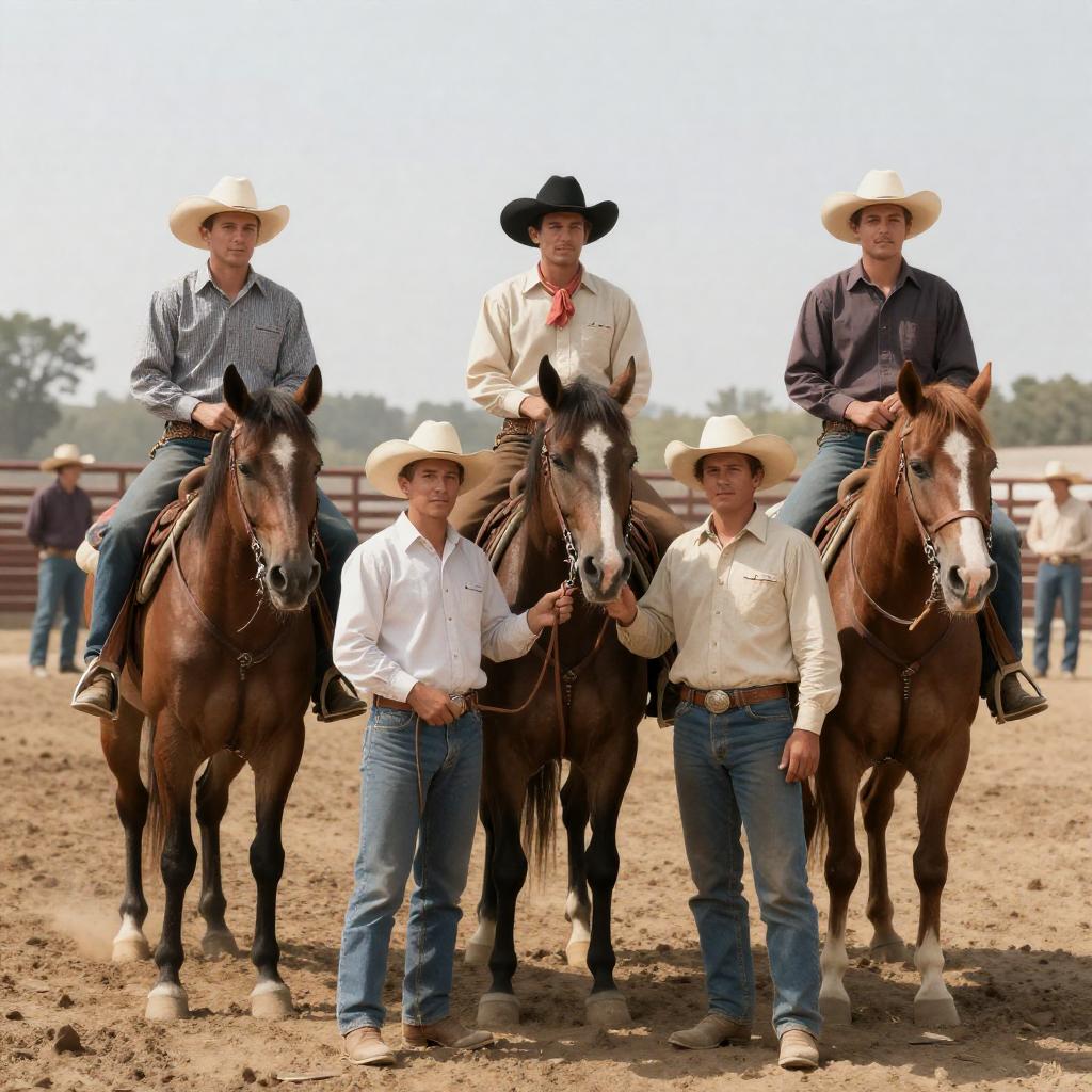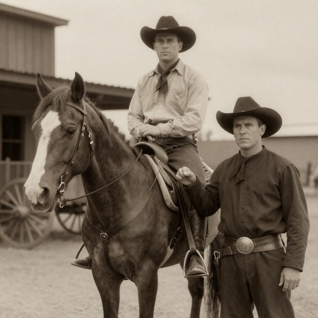 Sepia-toned photograph featuring two serious-looking cowboys dressed in traditional Western attire, including wide-brimmed cowboy hats and neckerchiefs. One cowboy, wearing a light shirt and dark hat, is seated on a brown horse with a white blaze on its face. The other cowboy, dressed in darker clothing with a large belt buckle, stands beside the horse. Background shows an old wooden building and a wagon, evoking an old Western setting.