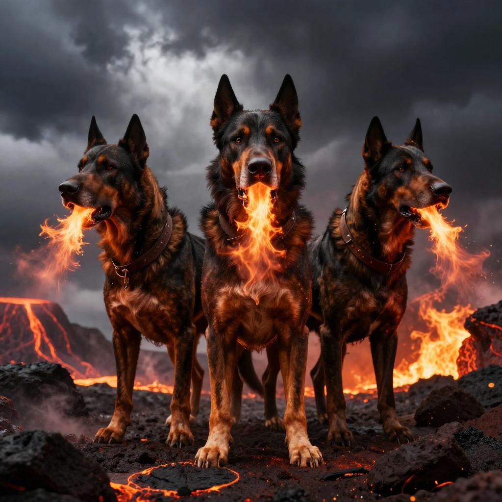 Majestic Cerberus Siblings in Volcanic Landscape