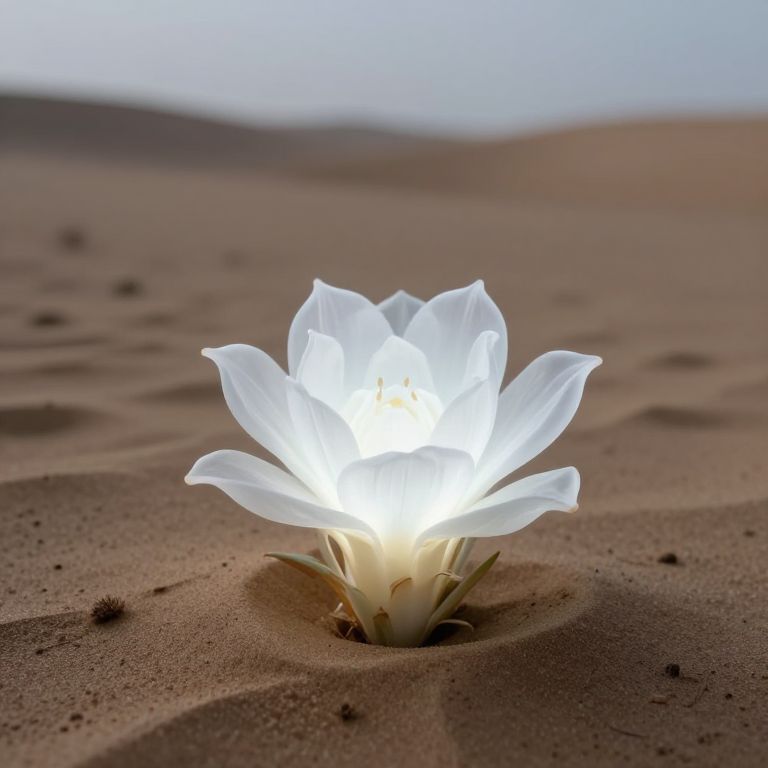 In a barren desert landscape, a luminous white flower emerges from the sand, its translucent petals glowing with an ethereal light that defies the harsh surroundings, as if born from whispered secrets carried by the wind.