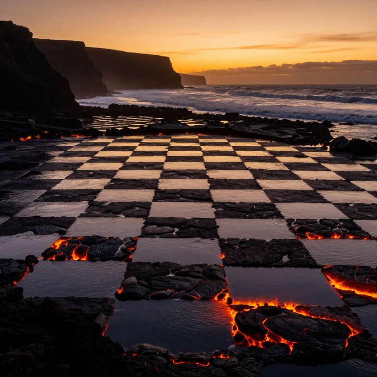 Sunset illuminates a surreal checkerboard ocean where alternating squares of dark water and fiery lava stretch toward the shore, creating a dramatic contrast against the silhouetted cliffs and rolling waves.