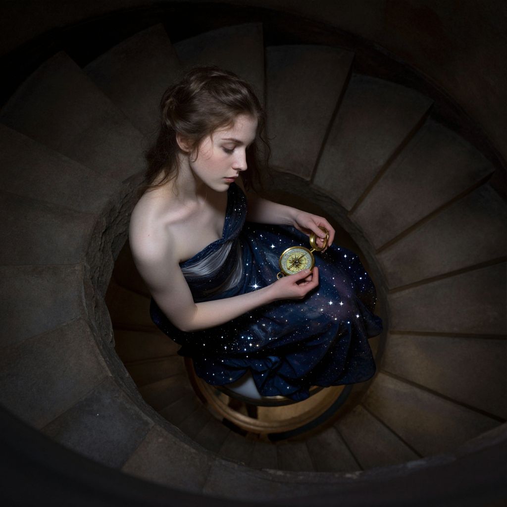 An enchanting digital masterpiece blends the mesmerizing techniques of two iconic artists, creating a surreal portrait session in a dreamlike setting. The scene, viewed from above, features a celestial being, a young woman with alabaster skin, seated upon a spiraling staircase. She is dressed in garments that shimmer like distant stars and holds a golden compass, symbolizing the exploration of both internal and external realms. The lighting technique, reminiscent of chiaroscuro, casts dramatic shadows across her enigmatic features, evoking an emotional spectrum ranging from contemplation to epiphany in this transcendent fusion of timeless artistry and dreamlike vision.