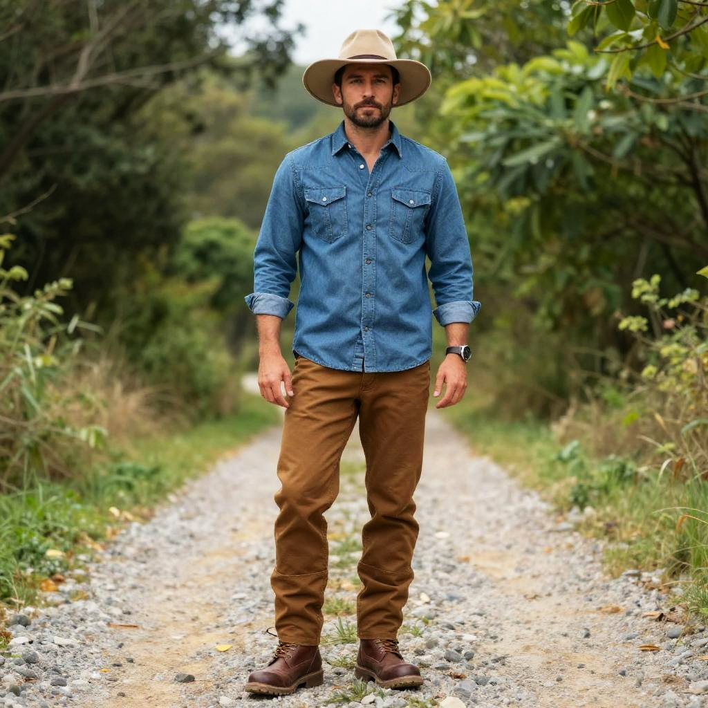 A man stands confidently on a gravel path surrounded by lush greenery, wearing a blue button-up shirt, brown pants, and sturdy brown boots. He completes his outdoorsy look with a beige wide-brimmed hat, giving off a rugged, stylish vibe perfect for nature exploration or casual country living.