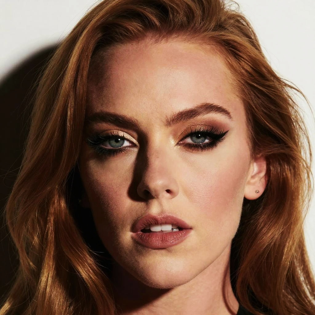 Age of Lindsay Lohan depicted in a stylized fashion editorial, bold makeup, retro 2000s aesthetics, dramatic shadows, artistic flair, high resolution