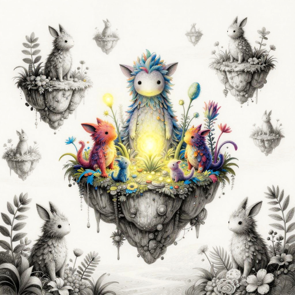 Free art AI illustrating a dreamy landscape with floating islands and AI-inspired creatures, using soft pastel tones and fluid shapes to evoke a sense of freedom and imagination in a digital fantasy style.