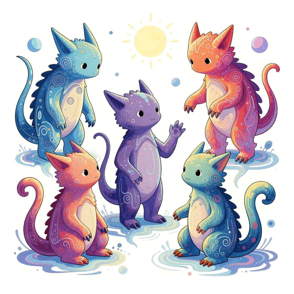 Digital illustration of cute, cartoon-style floating cat-like creatures on grassy islands, set in a vibrant, sunny, cloud-filled landscape.