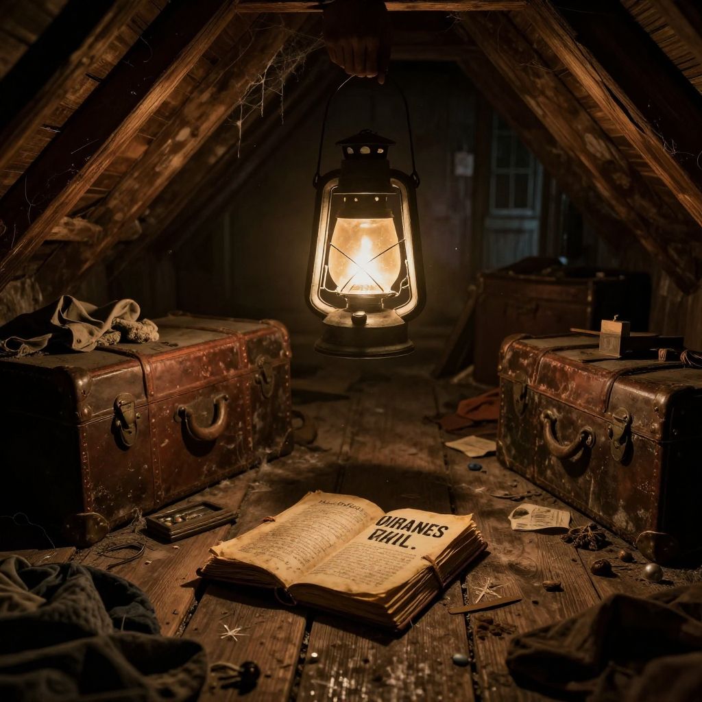 ((attic, lantern, warm glow, flickering light, cobwebs, old trunks, cluttered, eerie shadows, forgotten treasures, dusty journal), rafter, attic floor, floorboards, warning, holding lantern high), hidden journal, forgotten clothes, rummaging, darkness, barely illuminated, warm, warn, high angle, (creepy, spooky, mysterious, haunting, (high-resolution, HDR, UHD, detailed, photorealistic)), horror, gothic, Edgar Allan Poe, haunted mansion, attic exploration