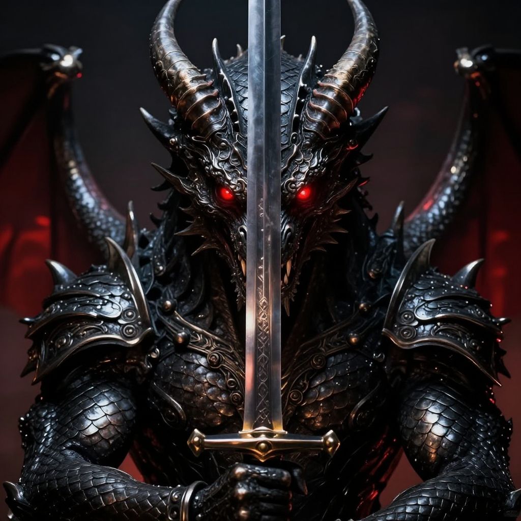 Photograph of a menacing, black-scaled dragon warrior holding a gleaming, reflective sword with a central flame-like glow. The dragon has glowing red eyes, large curved horns, and intricate, spiked armor. Its wings are partially visible in the dark, smoky background, which is tinged with red hues. The dragon's claws grip the sword, emphasizing its strength and power. The image is highly detailed, with a focus on the metallic textures of the armor and the sharpness of the sword, creating a dark, epic fantasy atmosphere.