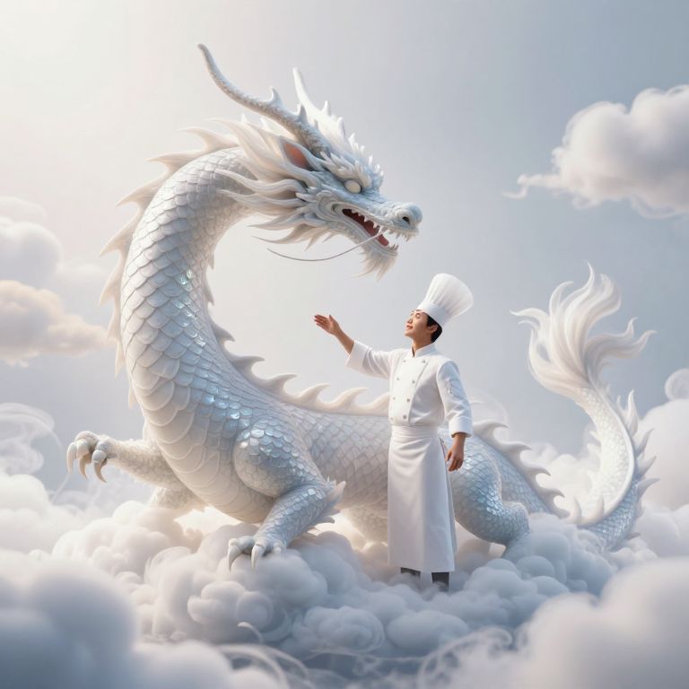 In this digital illustration, a white-clad Asian chef with a round face and black hair stands on fluffy white clouds, facing a majestic, white, serpentine dragon with glowing scales and fiery eyes. The dragon's long neck coils gracefully, and its tail curls behind. The chef, wearing a traditional white chef's hat and long coat, raises his right hand in a gesture of respect. The background is a bright, ethereal sky filled with soft, white clouds. The dragon's scales shimmer, creating a dramatic contrast with the chef's uniform. The image combines realistic textures with a fantasy element, blending culinary and mythical themes.