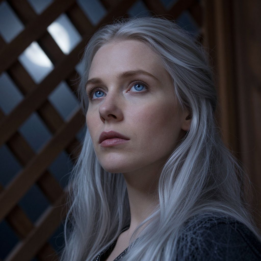 Craft a photorealistic portrait capturing the serene enigma of a Nordic woman with piercing ice-blue eyes and timeless beauty. Ethereal moonlight filters through an ancient wooden lattice, softly illuminating her delicate features—high cheekbones, full lips, and cascading silver hair. From a low angle, her captivating gaze is emphasized, suggesting contemplation or an unspoken secret shared with the viewer. This interplay of light, texture, and emotion invites one into her world of wisdom and mystery.