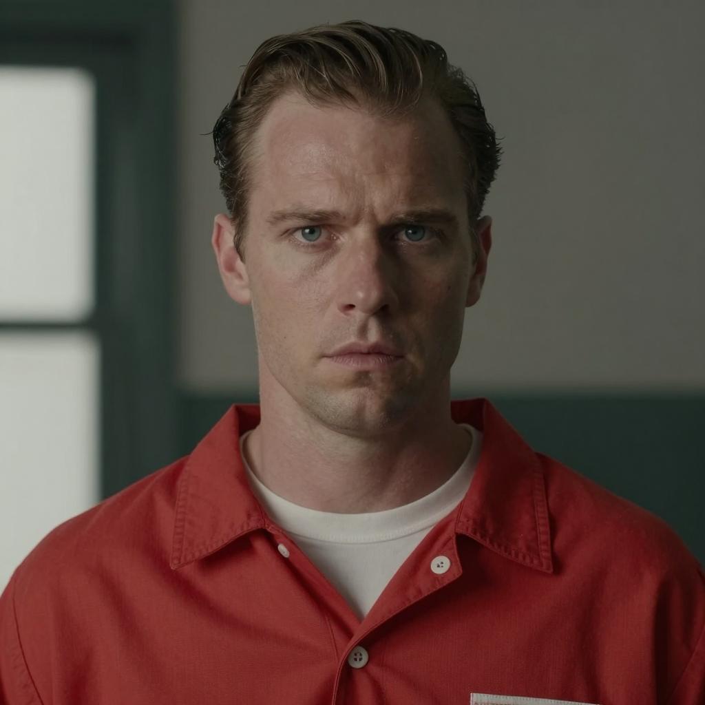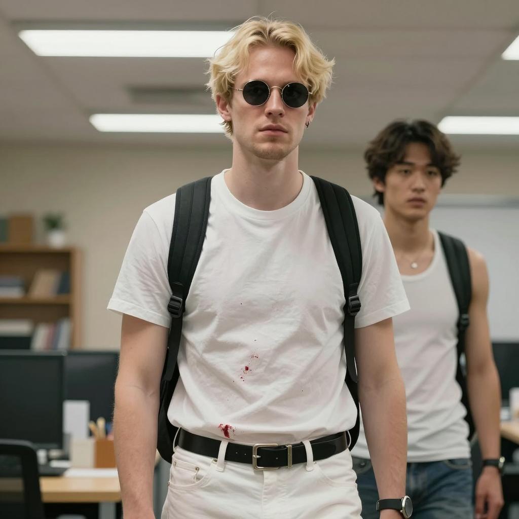 Man with light brown hair, wearing round sunglasses and beige jacket, standing next to a ured dark wall. Background has blue light and misty effect. His face is slightly turned to the right, with a neutral expression. Two horizontal light bars are in the background.